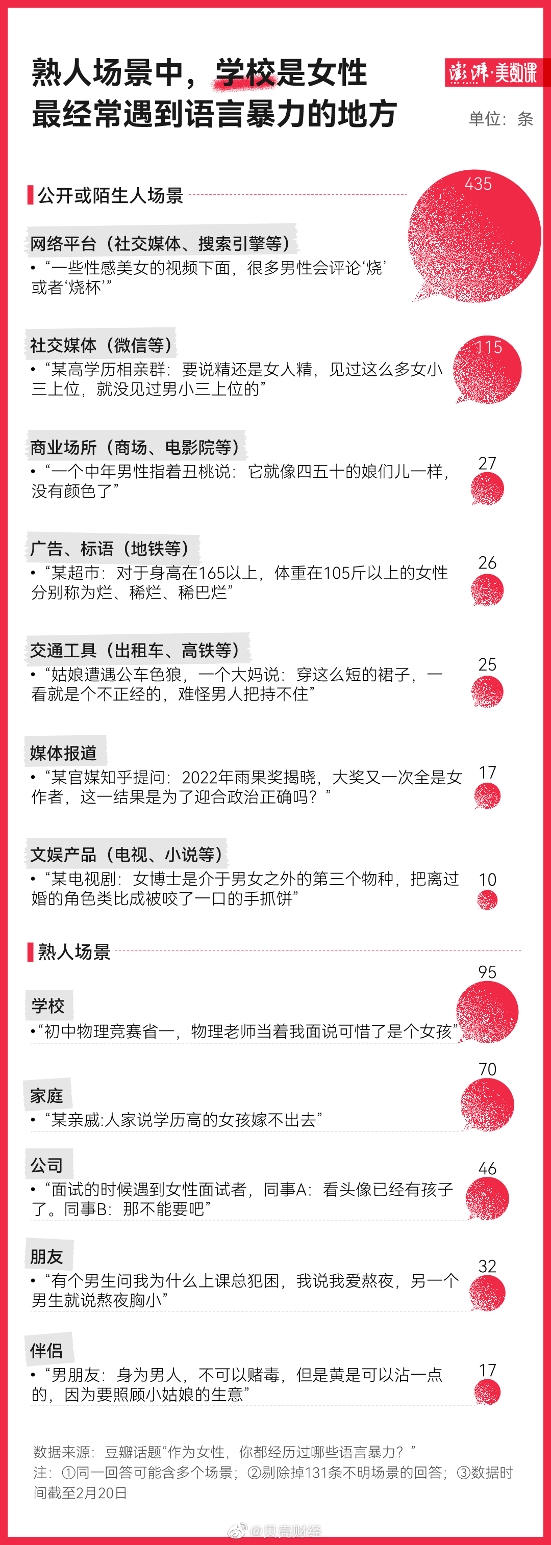 简介#性别语言暴力#【1017条分享帖,带你发现#生活中的性别语言暴力#】“穿这么短的裙子,一看就是不正经的”“身高不过 170,约等于...
