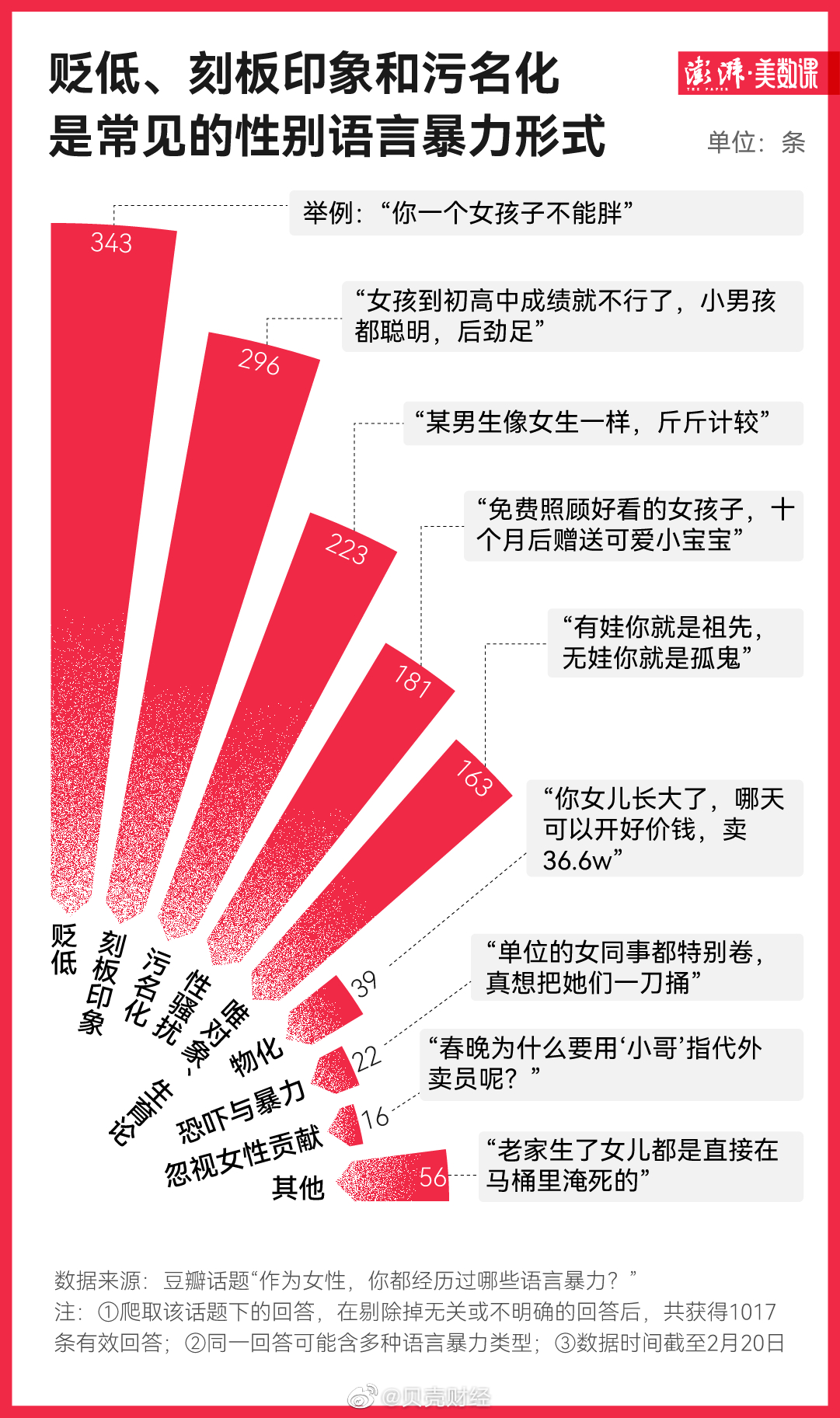 “针对女性的语言暴力是性别暴力(Gender based violence)的一种体现,是通过语言对女性实施的偏见、歧视和攻击。”中国传媒大学媒介与女性研究中心副主任王琴告诉澎湃新闻,她指出这是一个系统性、结构性的文化问题,而到了网络时代,女性更容易被凝视和物化,更加多样的网络性别暴力形式出现了,比如此前的粉色头发女孩因网暴而自杀。(澎湃)