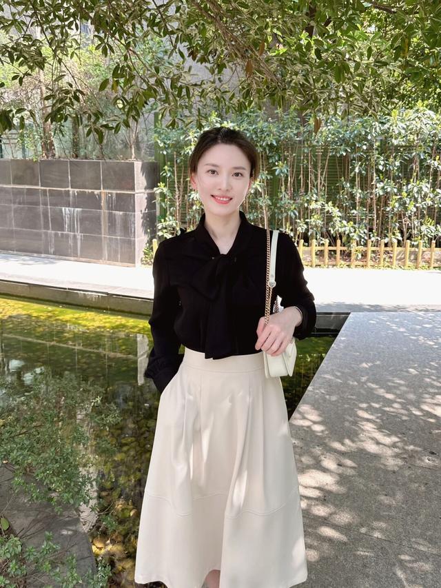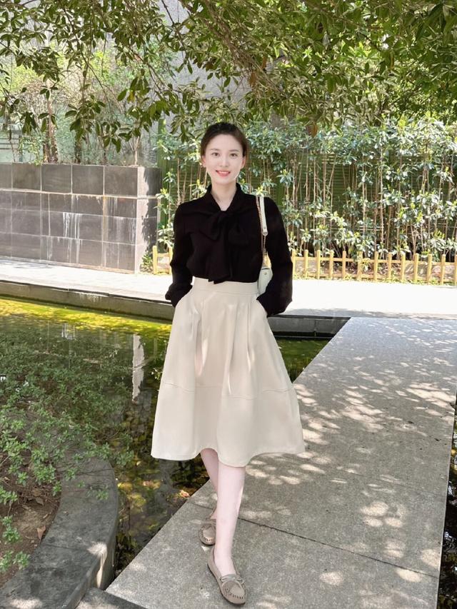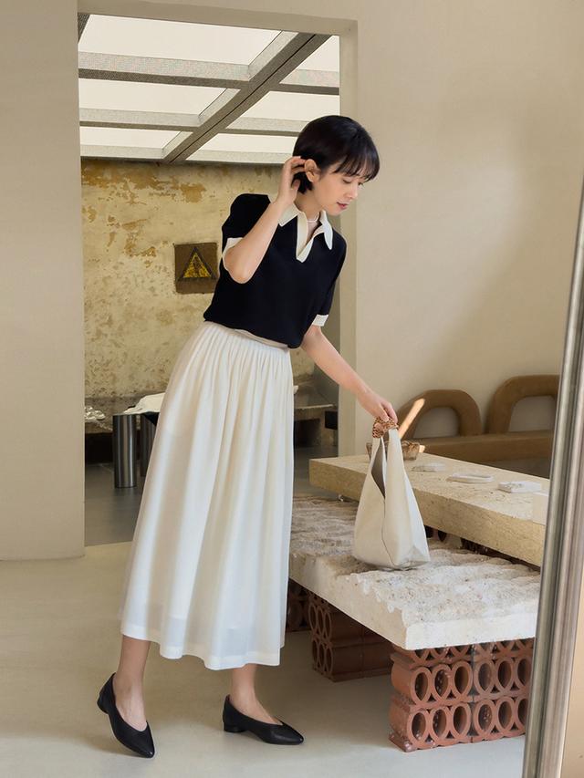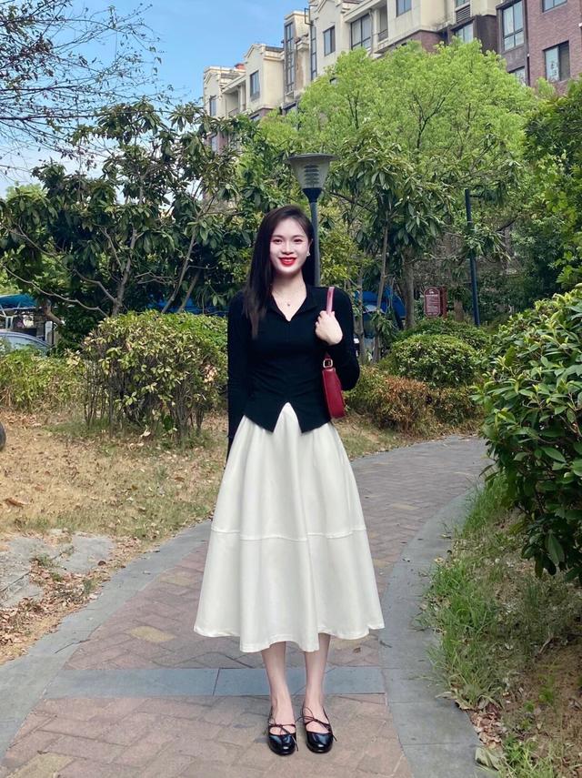 再搭配上一条a字半身裙之后,完美的遮住我们下半身的线条感,将我们胯宽腿粗的问题修饰住,更加的简洁干净,利落大气一些,简单温柔,时髦洒脱又大气,蓝白配色清新养眼,黑白撞色则更加稳重不挑人。