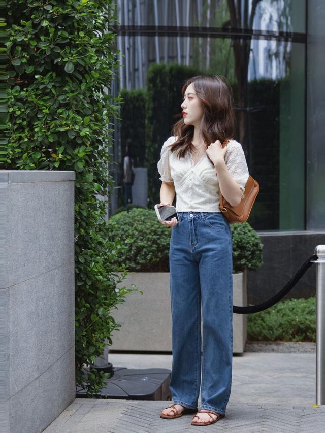 如果平时的穿衣风格偏向一些甜美可爱的风格呢,我们也可以借助这种白色的蕾丝花边上衣和牛仔阔腿裤搭配,精致温柔,甜美浪漫,可以轻松穿出满满的时尚感和高级感,更加的利落温柔,娇俏可爱