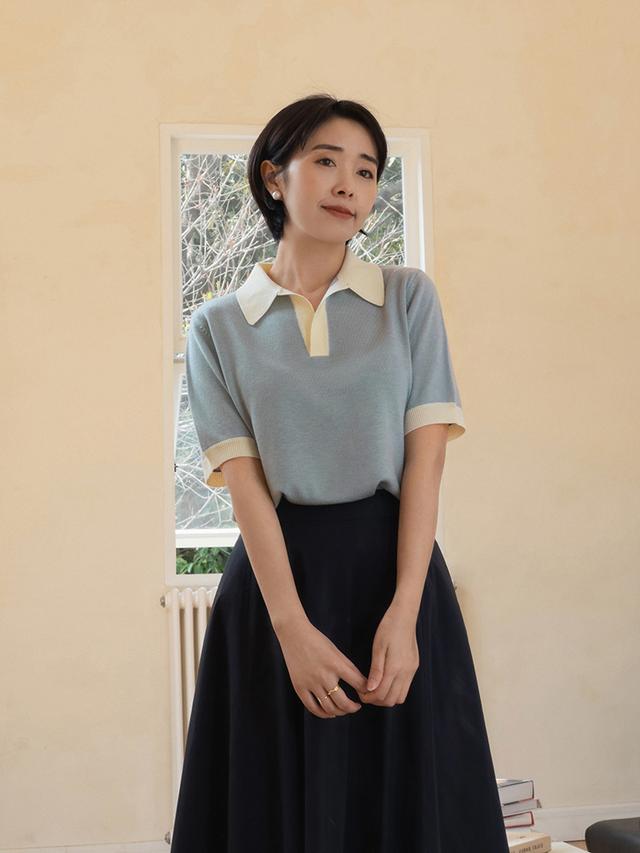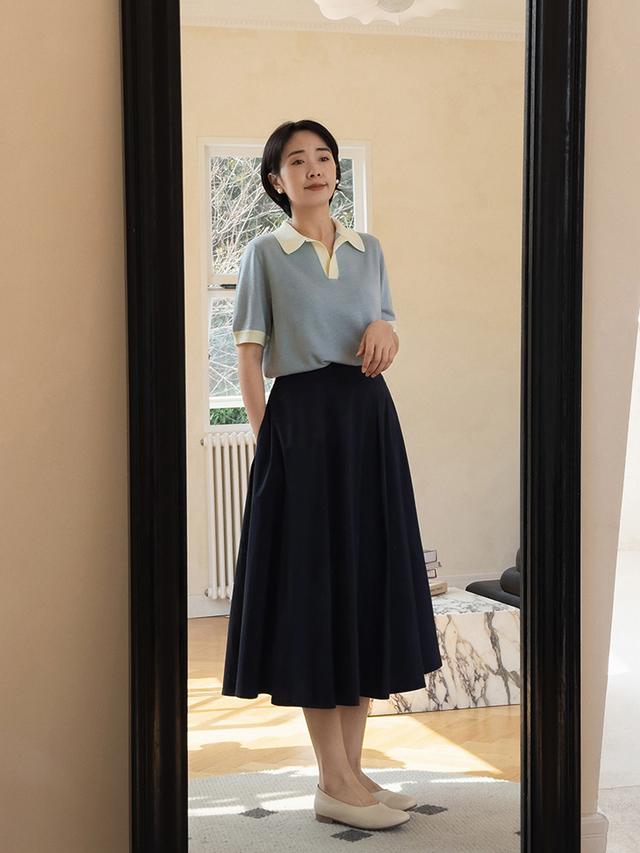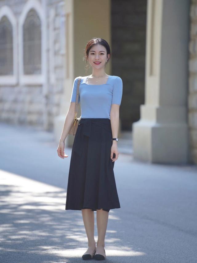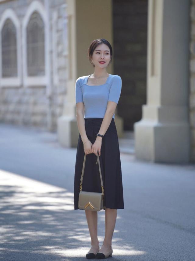 例如下面这一身用一件蓝色的方领针织衫搭配黑色的A字裙,配色是非常清爽简约的,而且小方领的剪裁设计带有一点法式风情,充满了复古韵味,气质乖巧又成熟