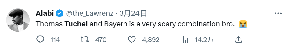 ——“我一觉醒来就听到了图赫尔成为拜仁新教练的消息。我们将再次看到一场充满活力的与图赫尔的对决,但这次会更加激烈。至于切尔西,祈祷你不要在任何地方遇到拜仁,他们会打小偷一样把你击溃。为图赫尔高兴