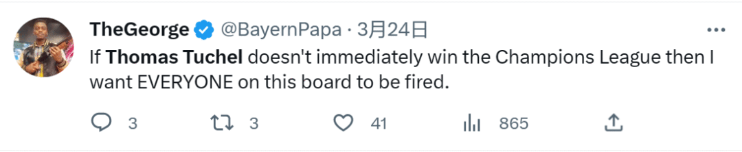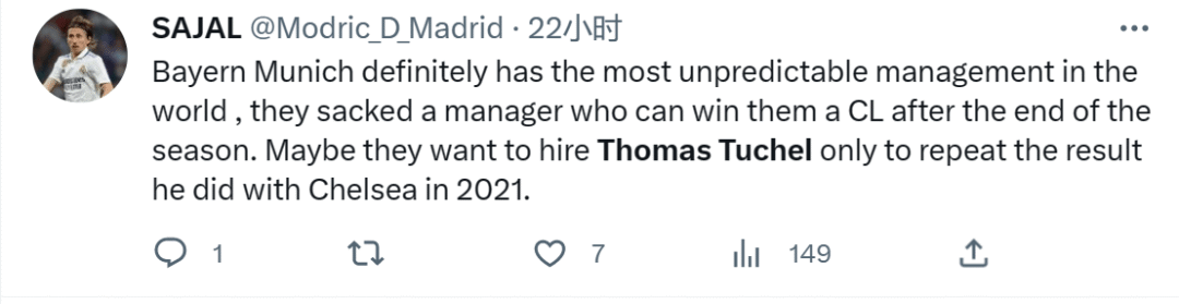 ——“拜仁慕尼黑无疑拥有世界上最不可预测的管理层,他们解雇了一位能为他们赢得欧冠冠军的主教练,也许他们任命图赫尔只是为了重复他在2021年在切尔西取得的结果。”