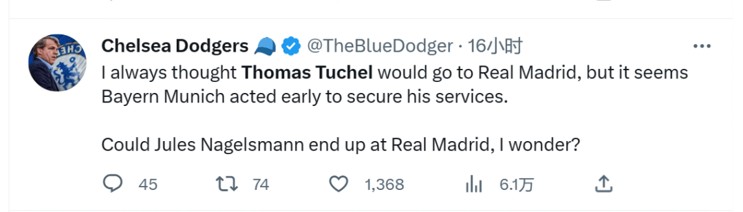 ——“我一直认为图赫尔会去皇马,但看起来拜仁慕尼黑很早就确定要任命他了。我想知道,纳格尔斯曼最终会加盟皇马吗?”