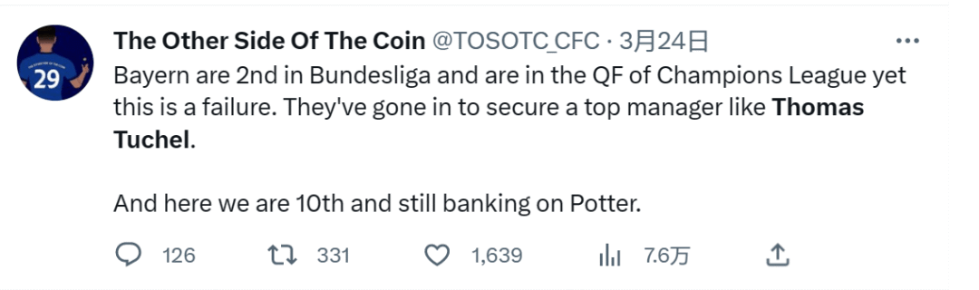 ——“拜仁目前在德甲排名第二,在欧冠进了四分之一决赛,但这对他们来说是个失败,于是球队任命了图赫尔这样的高级教练。现在我们都排名第10位了,还指望波特力挽狂澜呢。”