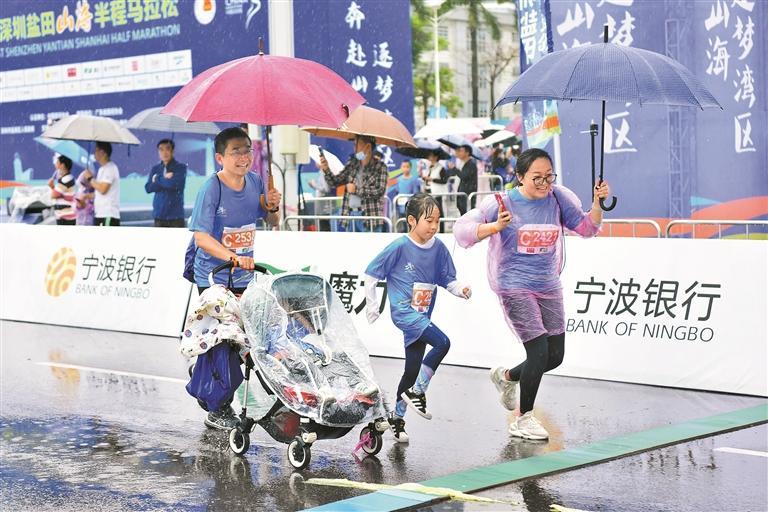 一对父母带着两个孩子参加盐田山海半程马拉松,雨中欢快奔跑。 受访单位供图深圳晚报讯 (记者 李娴 实习生 刘月辉) 3月26日,首届深圳盐田山海半程马拉松鸣枪开跑,蜿蜒在山海之间的“最美赛道”让众多跑友为之叹服,来自贵州的男子组“半马”冠军洪跃完赛后动情道:“起点在山边、终点在海边,赛道沿线的景色绝美,跑起来感觉无与伦比。”