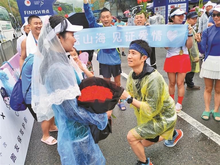 在首届深圳盐田山海半程马拉松的终点,来自“东湖牛牛队”跑团的阿伟单膝跪地,同伴将婚纱披在伊兰头上,四周亲朋手持玫瑰,拉着写有“蔚蓝山海,见证爱情”的蓝色横幅。阿伟深情地说:“今天是我们第一次一起跑完‘半马’,这么大的风雨都见过了,我们也没有放弃,人生的其他困难我都不害怕了。我爱你,嫁给我好吗?”
