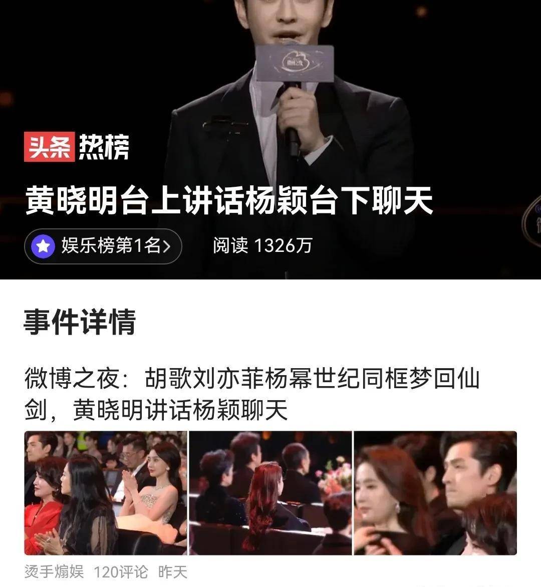 原标题:头条热榜:黄晓明台上讲话杨颖台下聊天