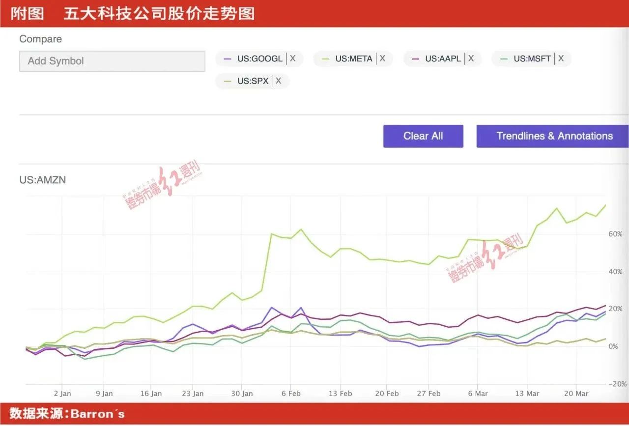 截至3月23日收盘,Meta报204.28美元。Wind数据显示,近三个月Meta、谷歌、微软、亚马逊和苹果分别上涨了70.6%、18.35%、14.6%、15.79%、19.54%。