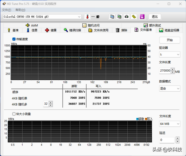 在HD Tune Pro中,我们将文件长度选择为200GB,来考察酷冷至尊神钥Air硬盘盒+七彩虹战戟CN700 1TB SSD的稳定性。
