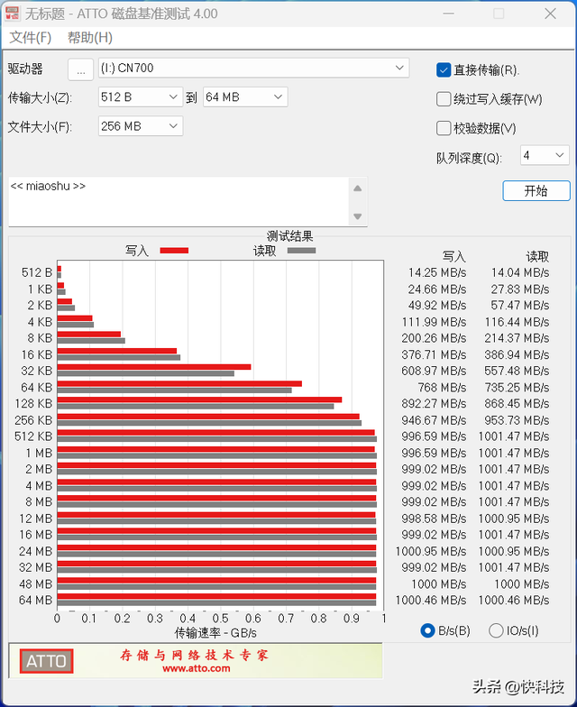 在ATTO Disk Benchmark测试结果中,对于0.5KB小文件的读写,酷冷至尊神钥Air硬盘盒+七彩虹战戟CN700 1TB SSD可以提供14MB/s的读写。