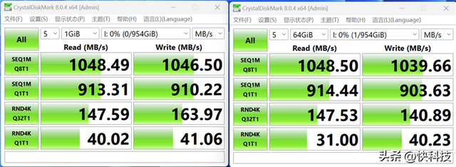 CrystalDiskMark测试结果,左为1GB测试结果,右为64GB测试结果。