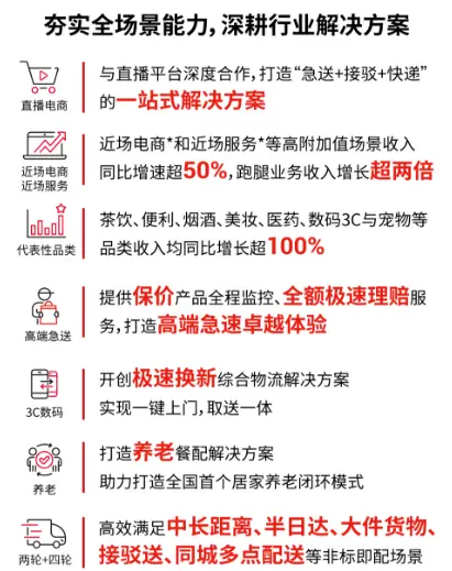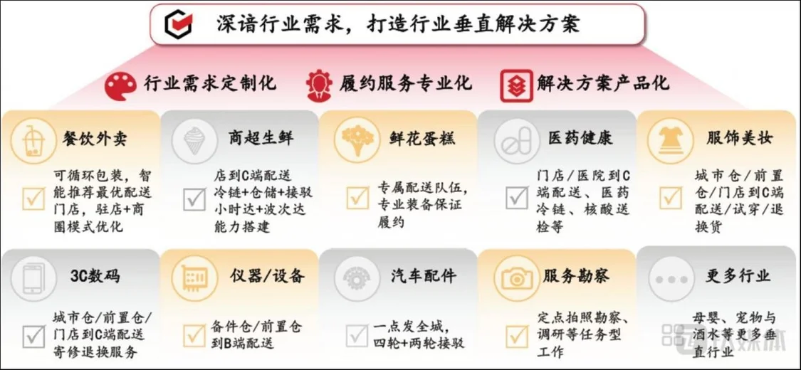 对于to B客户,顺丰同城深谙行业需求,以行业需求定制化、履约服务专业化、解决方案产品化打造了各种垂直行业解决方案,持续拓展全场景模型。比如针对商超生鲜搭建“冷链+仓储+接驳小时达+波次达”的一体化运力能力,针对3C数码、服饰美妆,推出“前置仓+小时达”极速发货模式,更实现了数码寄修等行业领先的定制化服务……