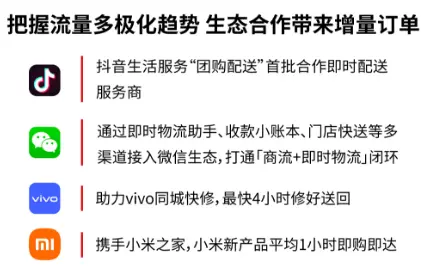另外,顺丰同城作为第三方配送平台的灵活性和定制能力,可以做到跟客户进行共创,共创服务标准、履约标准和物流体验。这些都是顺丰同城能实现流量承接、流量助力的原因。