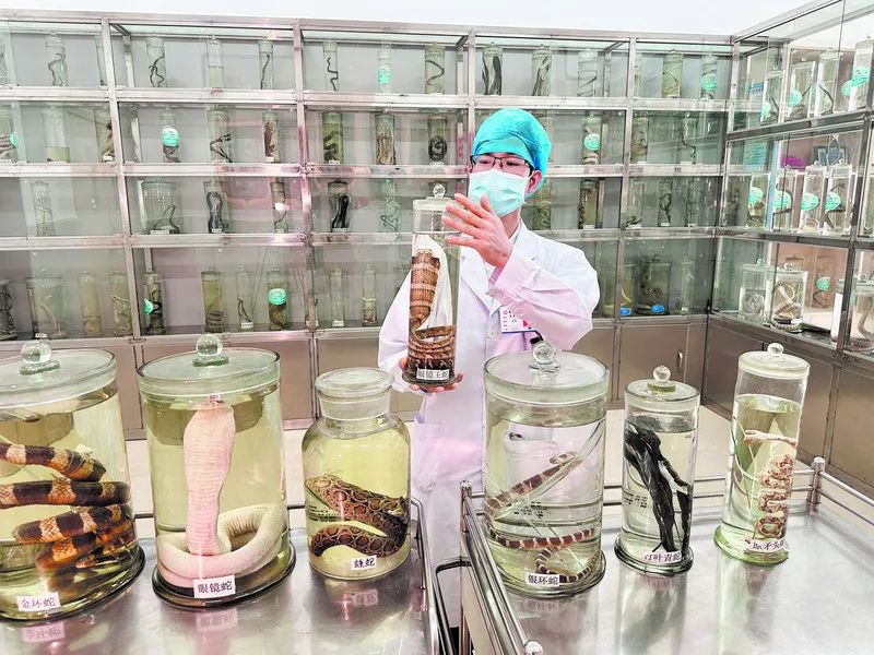 △在肇庆市第三人民医院蛇类展馆,蛇伤科医生周光德展示肇庆常见的几种毒蛇标本。西江日报记者 杨永新 摄冬眠过后的毒蛇,