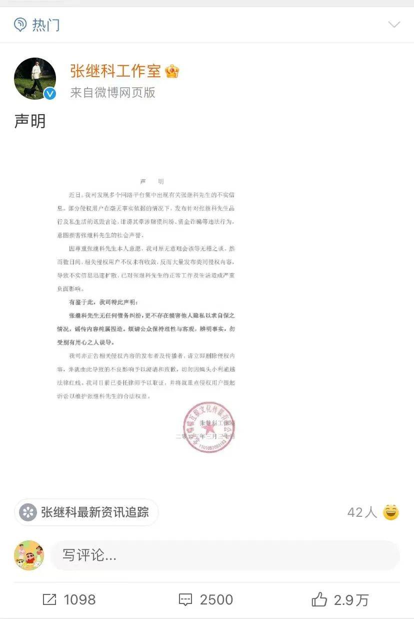 此次风波中,张继科工作室发布声明称“张继科先生无任何债务纠纷,更不存在损害他人隐私以求自保之情况,谣传内容纯属捏造”。
