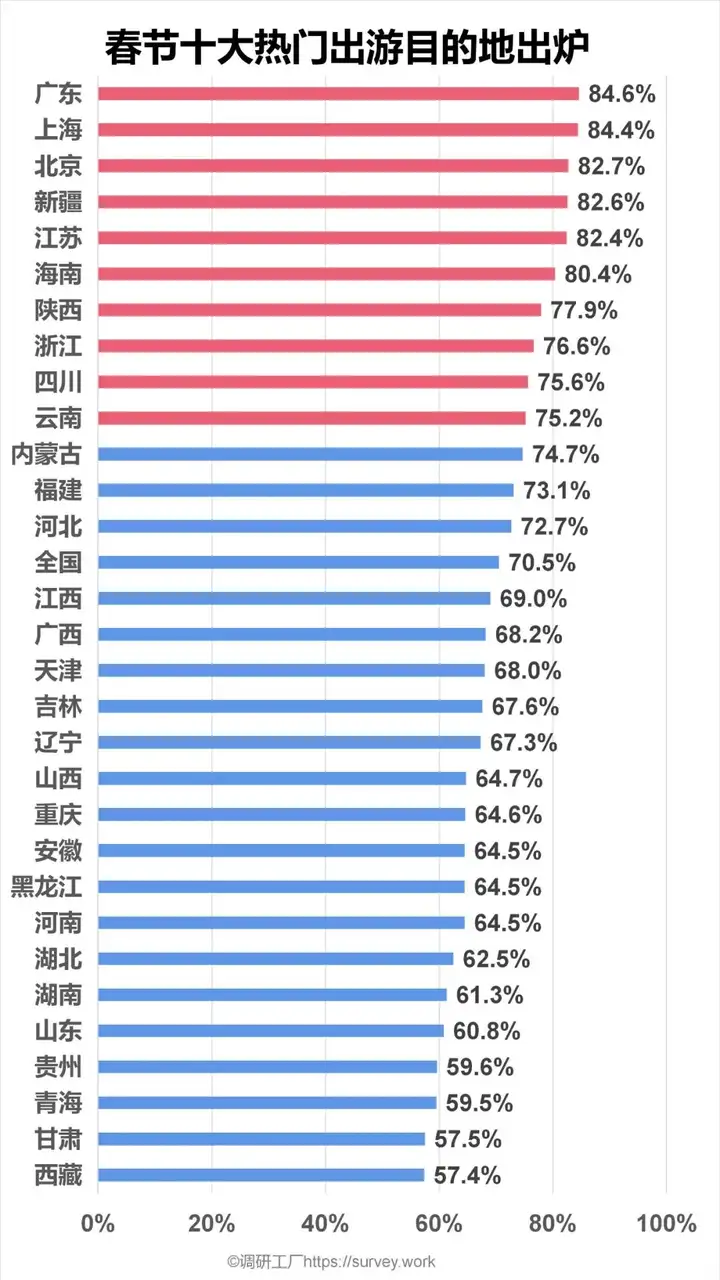 兔年春节哪些目的地将迎来旅游盛况?从调研工厂(https://survey.work)调查数据来看,广东、上海、北京、新疆、江苏、海南、陕西、浙江、四川和云南,跻身春节热门十大目的地。