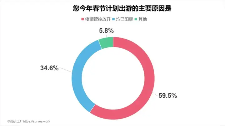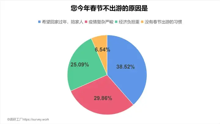 调研工厂(https://survey.work)调查数据显示,在表示春节期间放弃出游的人群中,有近四成是由于过年打算去陪伴家人。不知不觉疫情已三年,多少打工人没有过年回家,因此,过年陪伴家人成为了人们的首选。