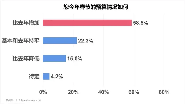 调研工厂(https://survey.work)调查数据显示,恰逢疫情后第一个春节,大家的“报复性消费”初露端倪,近六成的受访者表示春节期间的预算会高于往年。