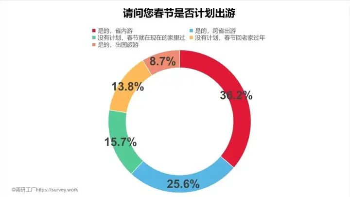 调研工厂(https://survey.work)调查数据显示,全国超七成的受访者表示自己春节期间“有出游计划”。其中,36.2%选择省内游,占比最高,其次是选择跨省出游,占比25.6%,选择出国的占比为15.7%。
