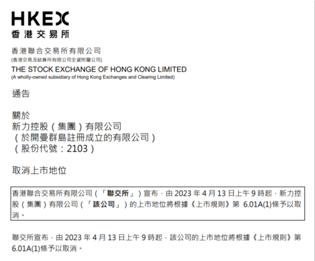 4月6日,身处港股市场的新力控股集团正式发布公告称,因公司未能于2023年3月19日前复牌,香港联合交易所有限公司宣布由2023年4月13日上午9时起,新力控股集团的上市地位将予以取消,即正式退市。