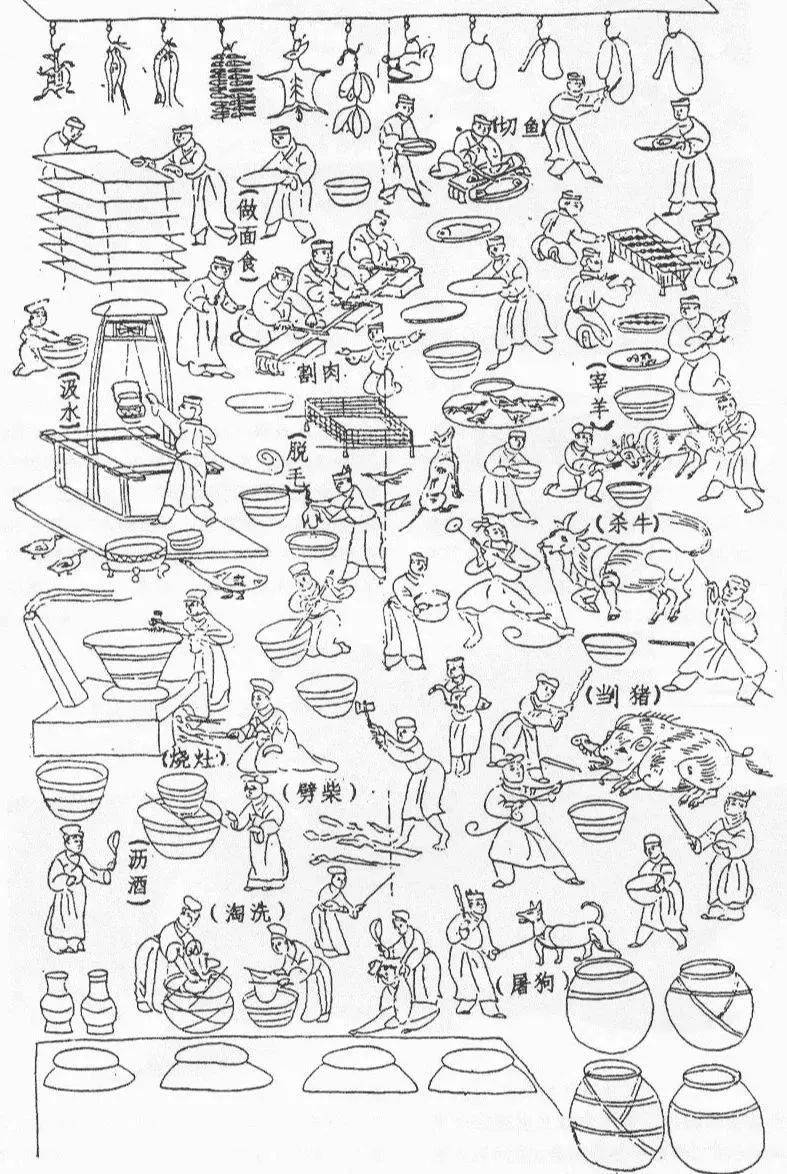 △山东诸城前凉台汉画像石上的《庖厨图》(拓片),为我们展现了宰羊、汲水、切菜、劈柴、烤肉的情景。