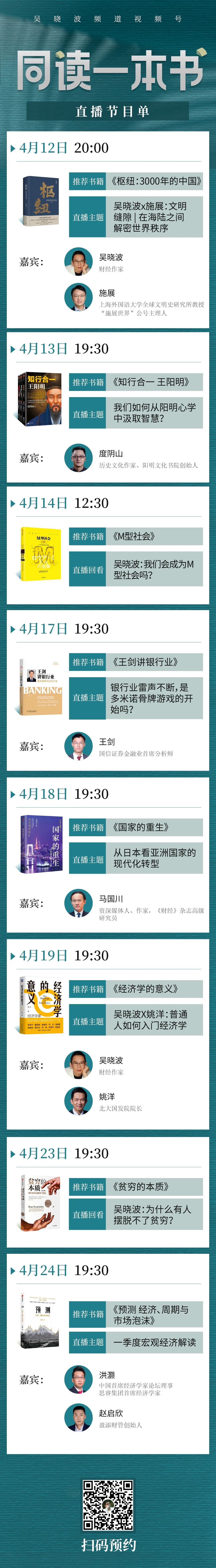 4月12日-4月24日,吴晓波频道直播间开启“同读一本书”系列直播,由吴老师领衔,邀请北大国发院院长姚洋、上海外国语大学全球文明史研究所教授施展、《财经》杂志高级研究员马国川等作者同读他们的著作。在世界读书日到来之际,邀请你每天同读一本,详情请查看文中节目单。