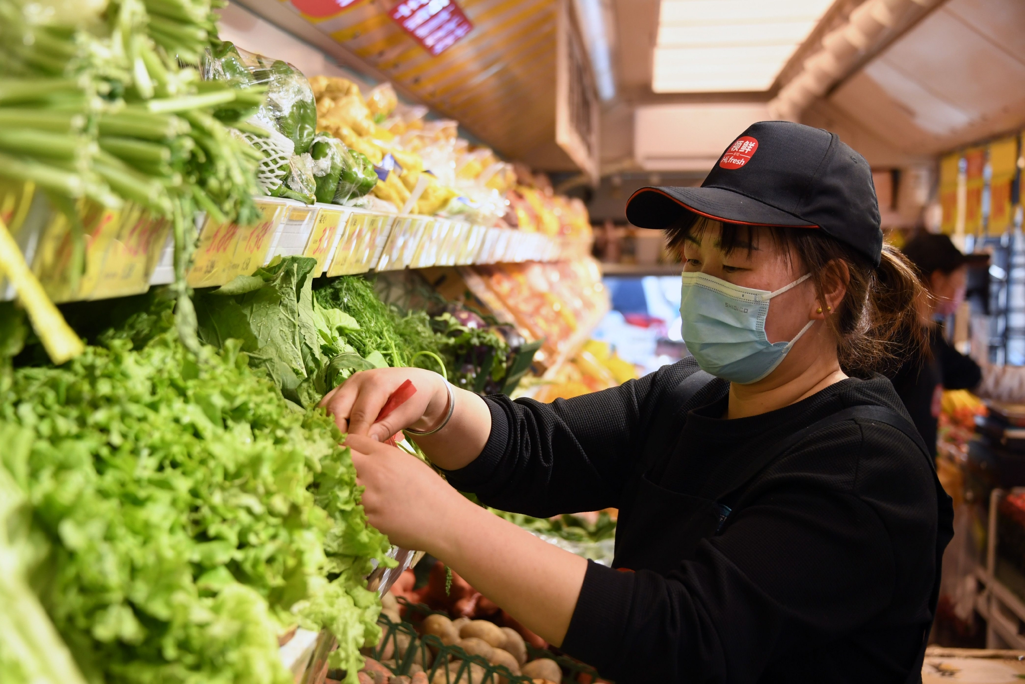 4月18日,在位于北京市朝阳区柳芳公交场站东北角的“公交便民驿栈”,工作人员在码放蔬菜。新华社记者 任超 摄