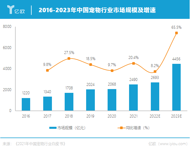 《2021年中国宠物行业白皮书》显示,中国城镇家庭宠物猫的数量为5806万只、宠物犬的数量为5429万只,合计超过1.1亿只;2021年全国城镇宠物消费市场规模达到2490亿元,预计到2023年将进一步增长至4456亿元。