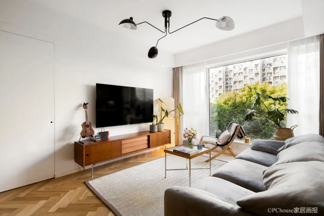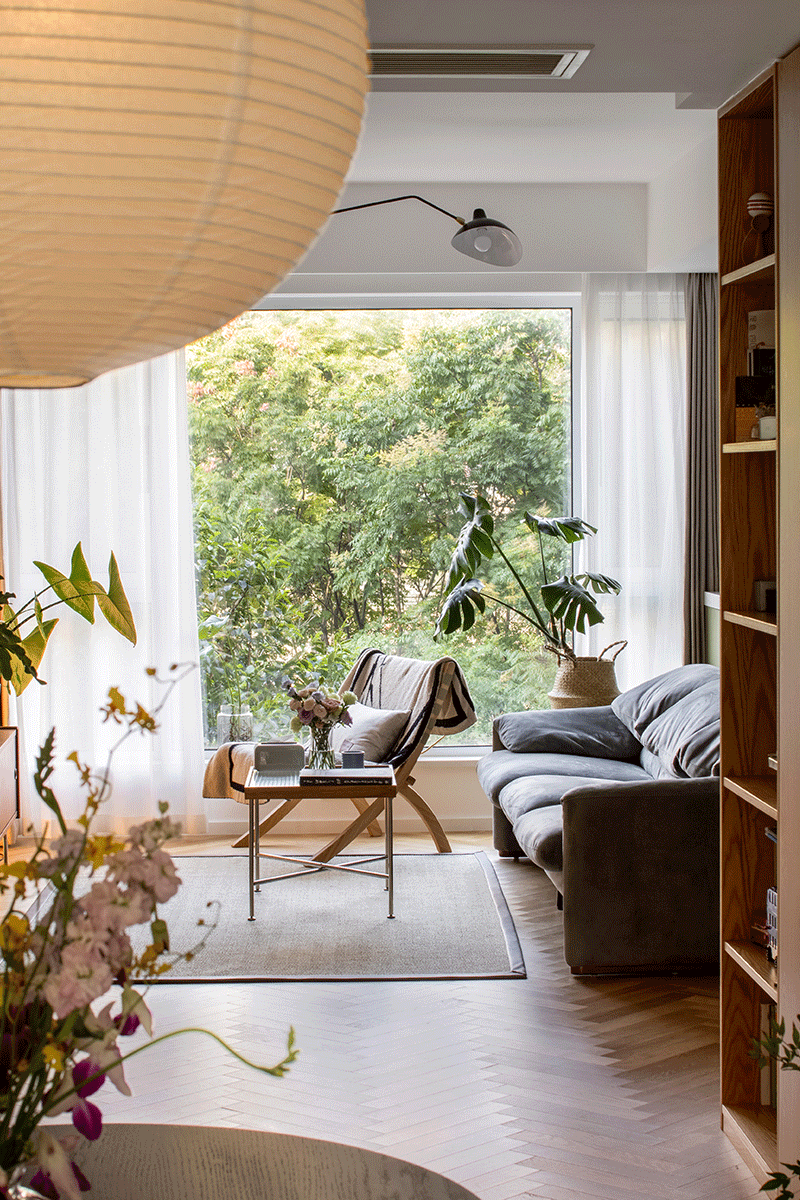 原户型的客厅狭小,于是设计师对空间进行合理优化,将阳台内包进来,在拓宽客厅面积的同时增加采光,不论是晴天还是雨天,窗外的绿意总能使人欣喜。