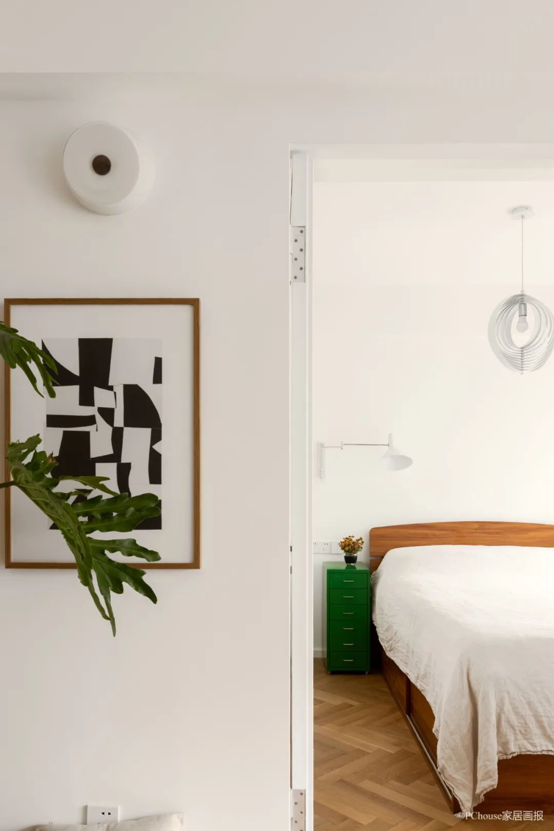 次卧主要以白墙搭配原木为主,床头以高饱和度的绿色柜子作点睛之笔,入门处的挂画让白墙增添了一份艺术感~
