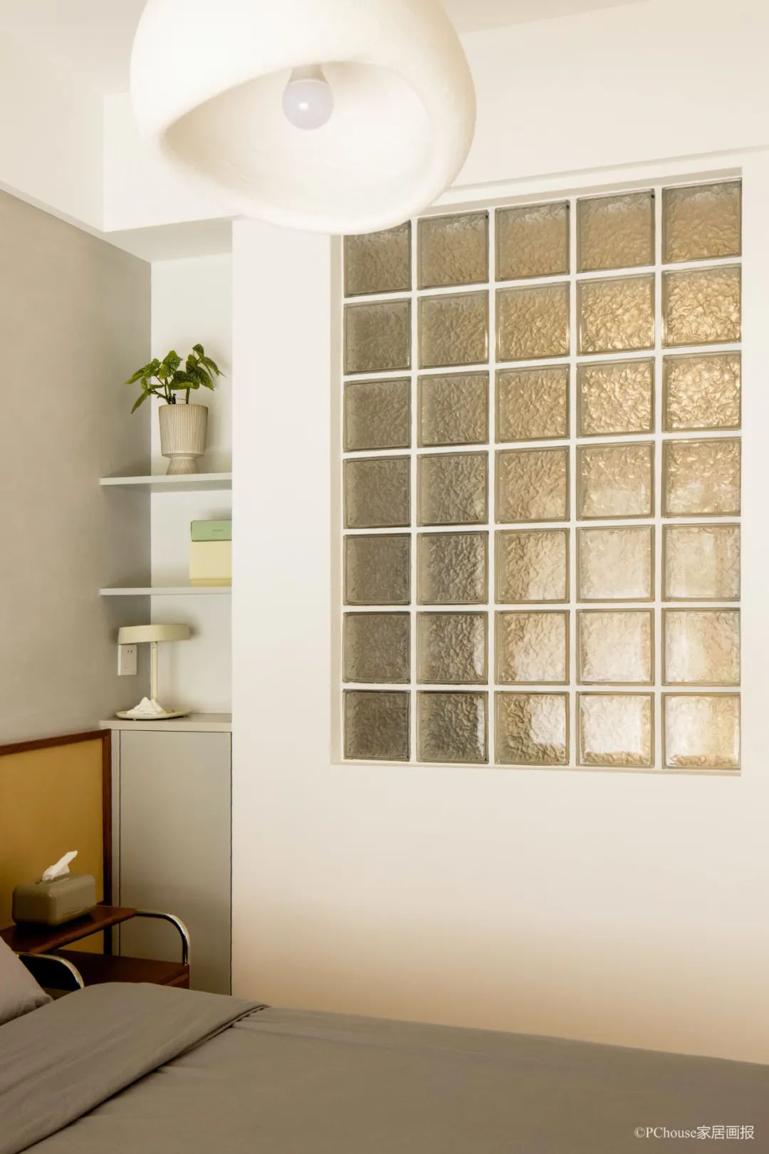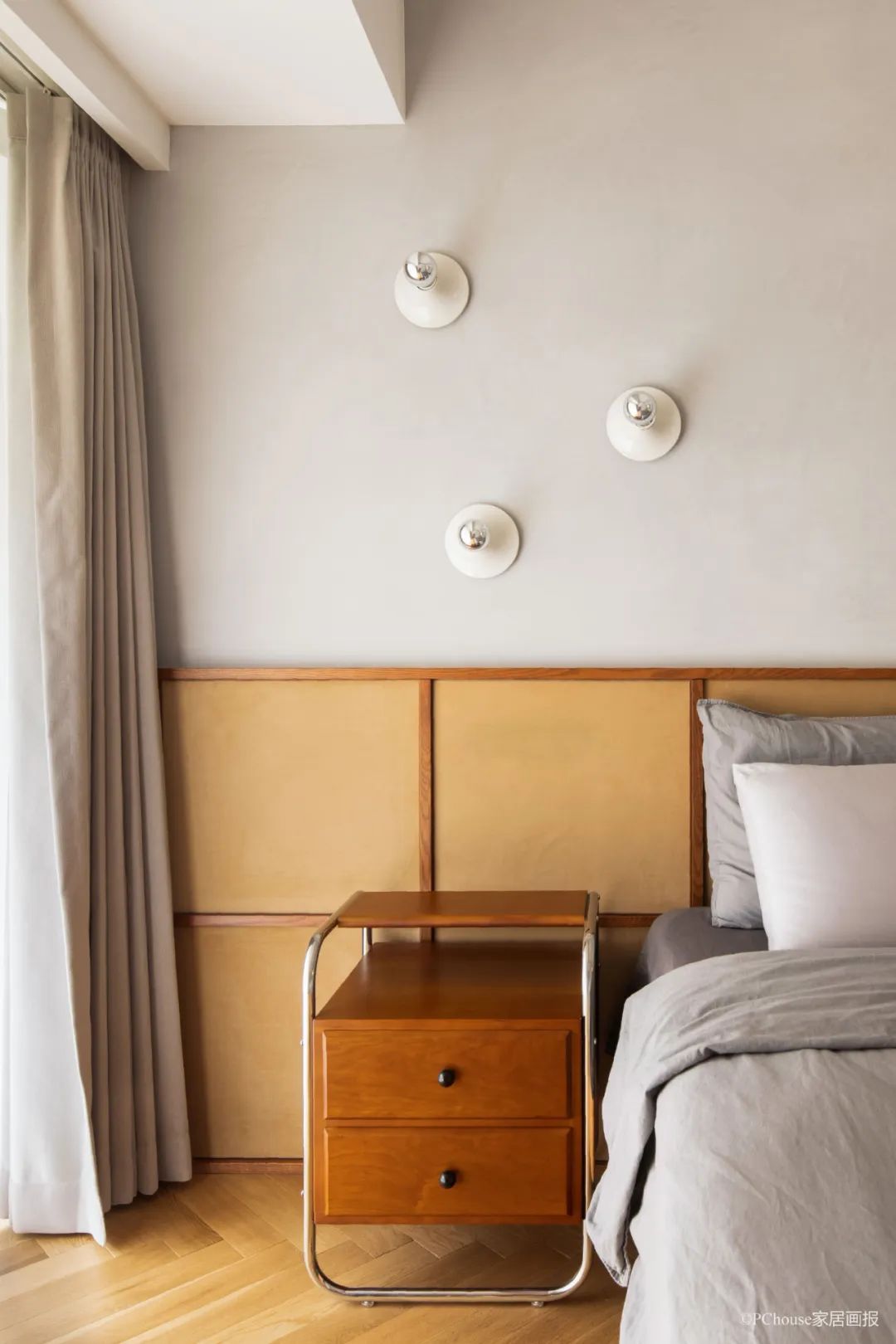 床头胡桃木色中古家具与棕色调床头背相呼应,散发出怀旧复古的氛围感。