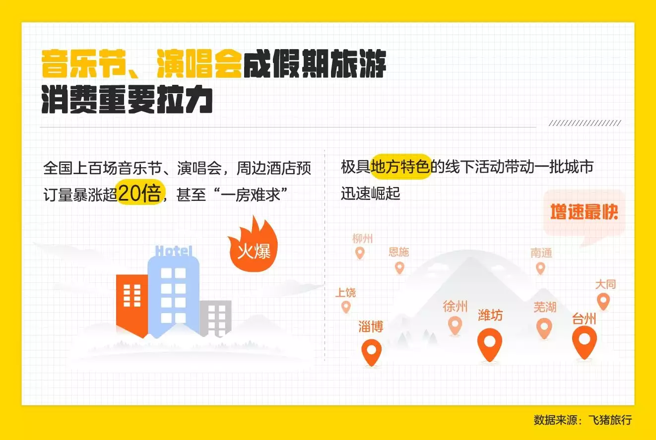 在“出去玩”的基础上,“玩得酷”越来越成为旅游消费的主流需求,高品质、内容丰富的旅游服务成为旅游平台和商家发力的关键方向。飞猪数据显示,五一假期客单均价同比提升超30%;高星酒店预订量同比去年增长超14倍。“旅行+演艺活动体验”在今年五一假期尤为火爆,一场久违的热闹节庆,成为“酷旅行”的标志。据不完全统计,五一假期前后全国各地将举办上百场演唱会、音乐节,是演出市场3年多来迎接的首个爆发窗口期。飞猪数据显示,五一假期演唱会、音乐节所在地周边的酒店预订量同比暴增超20倍,部分热门酒店甚至“一房难求”。音乐之外,“旅行+看展”“旅行+电竞”“旅行+刷博物馆”也是年轻人的心头好,旅游在周边消费场景上的溢出效应愈发明显。