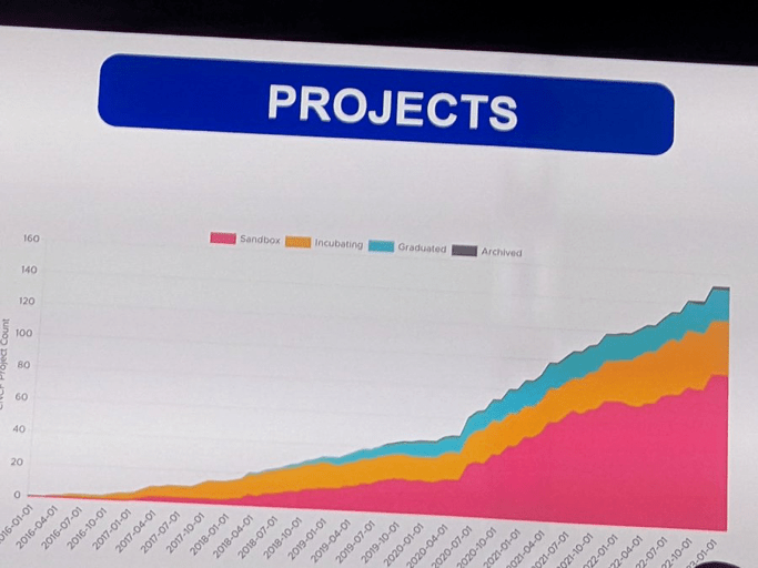 Ricardo 提到绘图是吸引CERN物理学家眼球的好方法,对于KubeCon的与会者来说也是如此,并且随着时间的推移,项目的增长仍令人印象深刻,截至目前,相关的项目数量达到了 159 个。