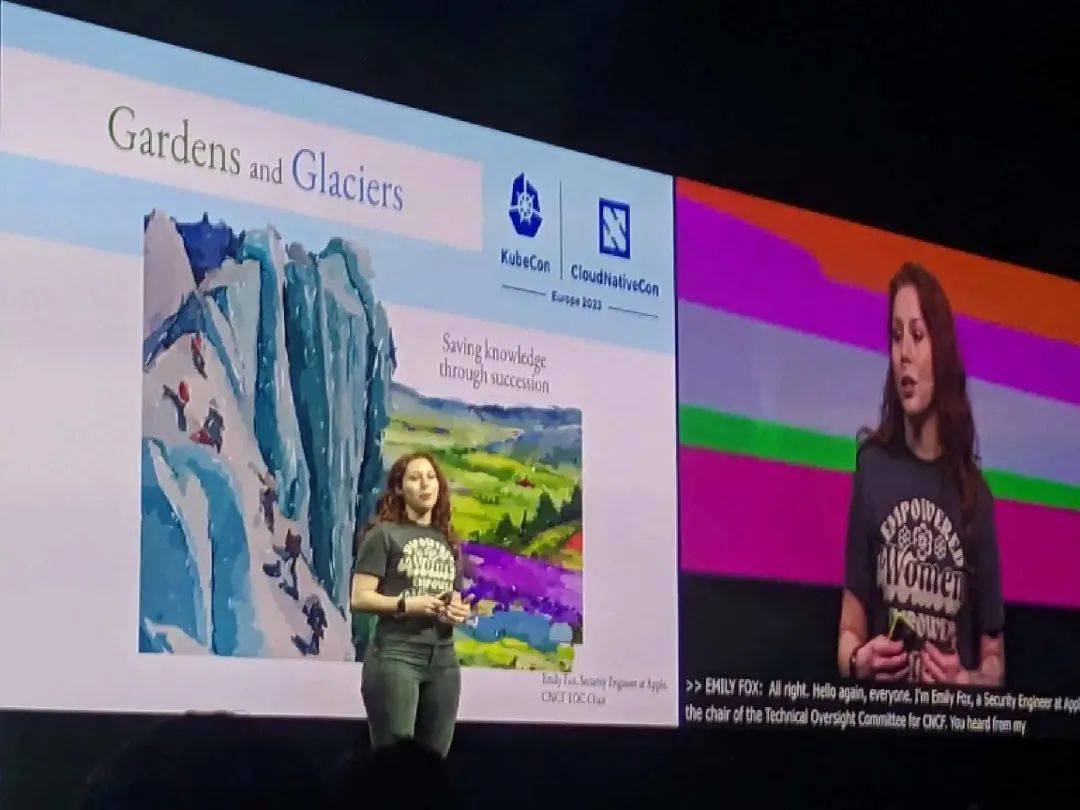 苹果安全工程师 Emily Fox介绍了“知识冰川”的概念,将开源CNCF 项目的生态系统,结合详细的教育类知识类比,将成长中的社区与种植花园进行比较,将增长知识与攀登冰川进行比较,及针对面临的一些挑战进行了精彩而富有洞察力的演讲。与会者也表示非常高兴了解冰川的事实,比如提到由于岁月的压缩,冰川最蓝的部分是最纯净的。