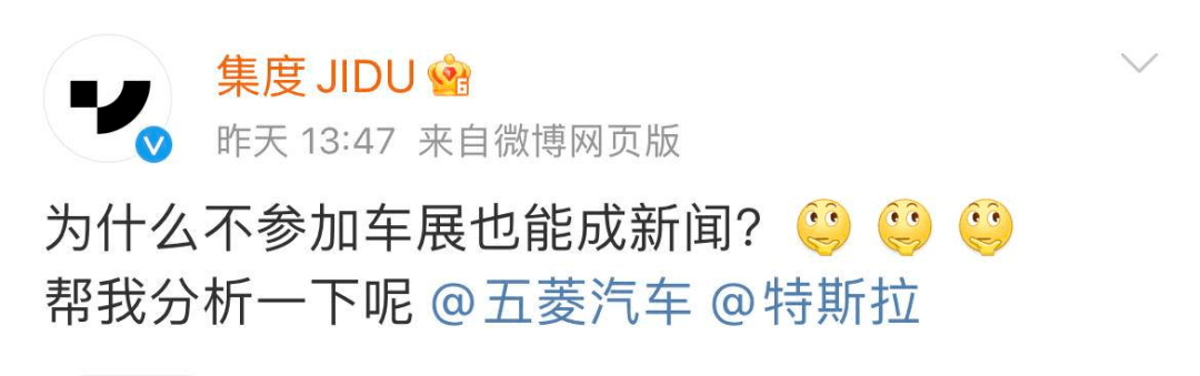 除了特斯拉之外,此前宣传火热的集度汽车和上汽通用五菱也是缺席车展的。甚至还有消息传出,集度因没有造车资质,所以被主办方拒绝参展的请求。虽然集度汽车已经辟谣了,但此前大小车展都到位,集度缺席上海车展,所以遭到格外的争议。