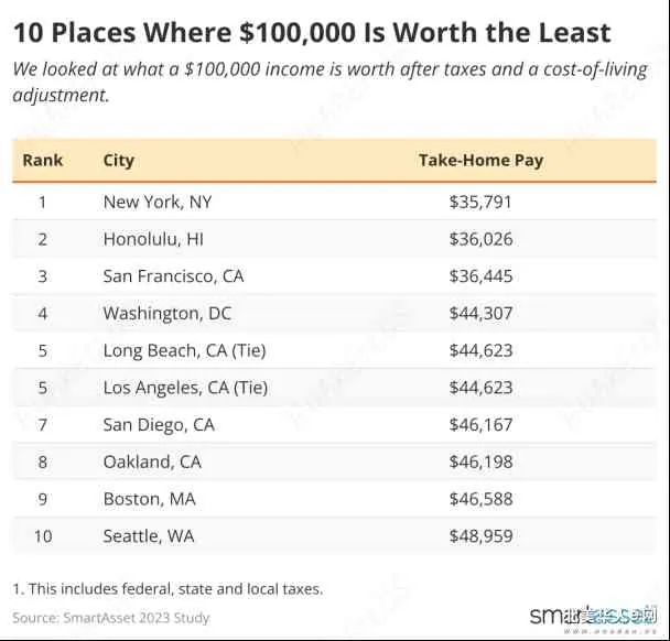对于许多人来说,薪水超过10万美元是成功的标志,但实际工资则取决于你住在哪里。如果你住在纽约市,在纳税以及扣除高昂的生活成本后,实际工资只剩3.6万美元。
