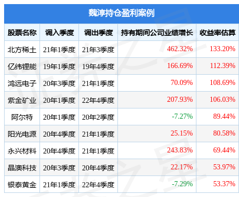 魏淳管理的前海开源盛鑫混合A基金在21年1季度买入北方稀土,在持有2个季度后在21年3季度卖出。持有期间的估算收益率为133.2%,持有期间北方稀土在2020年到2021年的年报归属净利润增幅达462.32%。