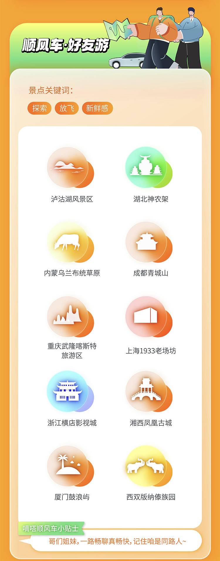 五一假期“好友同游”十大顺风车出游热门景点,分别为:泸沽湖风景区、湖北神农架、内蒙古乌兰布统草原、成都青城山、重庆武隆喀斯特旅游区、上海1933老场坊、浙江横店影视城、湘西凤凰古城、厦门鼓浪屿、西双版纳傣族园。