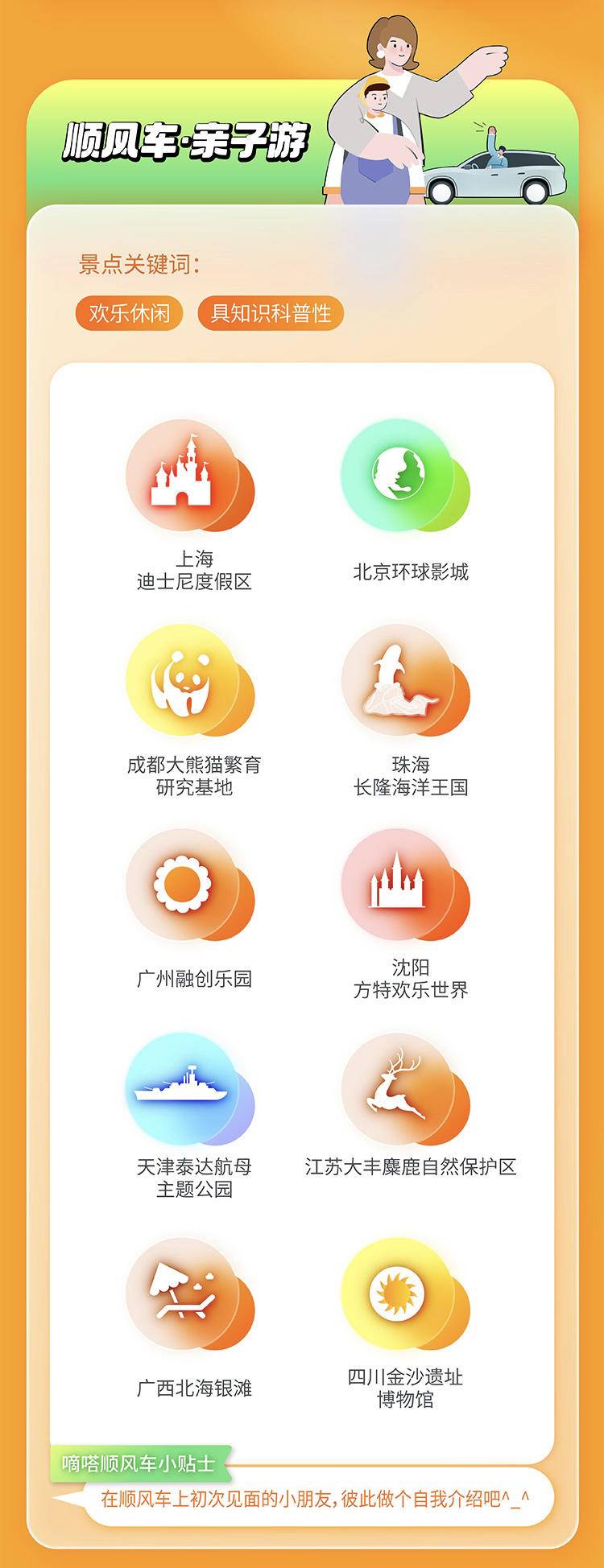 很多家庭带孩子出游时,关注娱乐性和科普趣味性,希望孩子能够在快乐玩耍中增长知识和见识。“亲子游”前十大顺风车出游热门景点,分别为:上海迪士尼度假区、北京环球影城、成都大熊猫繁育研究基地、珠海长隆海洋王国、广州融创乐园、沈阳方特欢乐世界、天津泰达航母主题公园、大丰麋鹿自然保护区、广西北海银滩、四川金沙遗址博物馆。