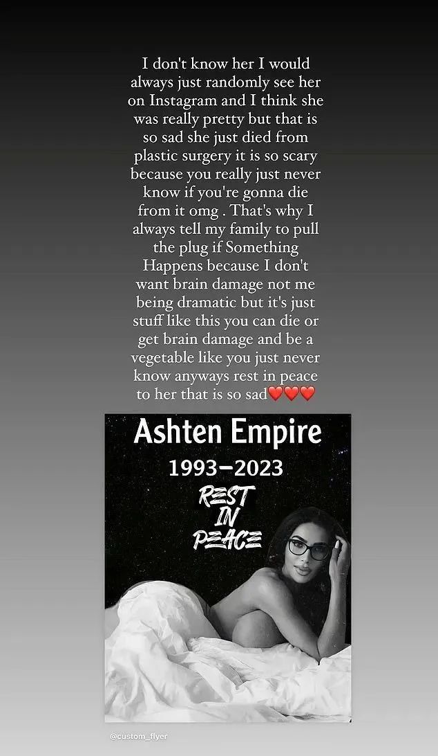 “我不认识她,但总在Ins上看到她。她真的很漂亮,她的去世实在太可惜了。