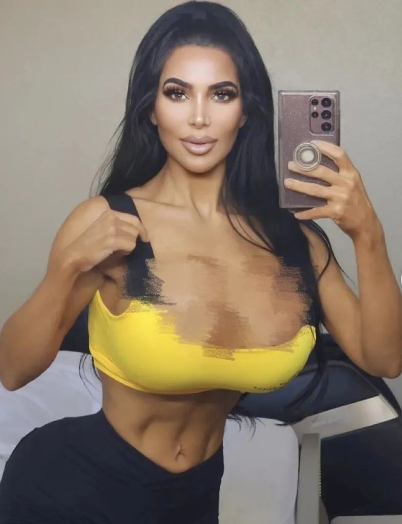 照片上,她穿着黄色运动文胸和紧身黑色短裤自拍,细腰翘臀,如同金姐的孪生姐妹,还是身材“升级版”。