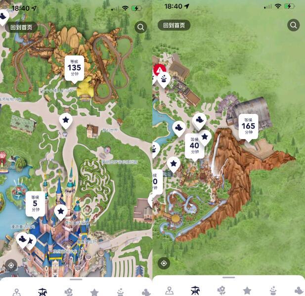 4月30日下午六时许,翱翔·飞跃地平线、七个小矮人矿车等热门项目仍需排队超过两个小时。图片来源:迪士尼度假区app截图