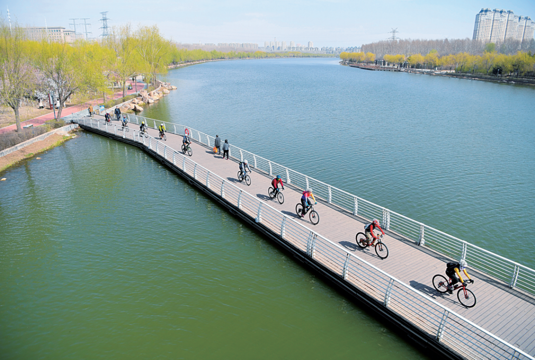 骑行爱好者穿行在伊通河畔的绿树碧水间。