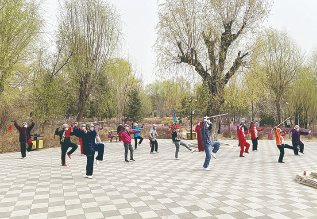 文化广场的林间花下,市民悠闲地打起太极拳。