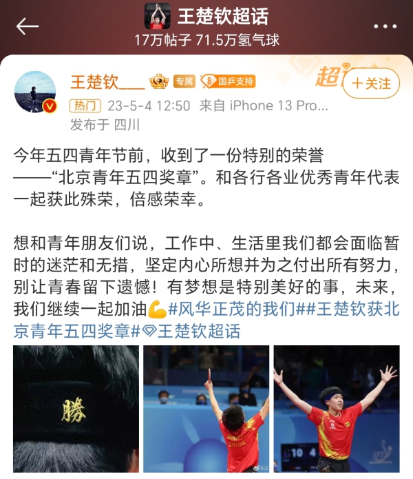中国男子乒乓球队运动员王楚钦发布微博:今年五四青年节前,收到了一份特别的荣誉——“北京青年五四奖章”。和各行各业优秀青年代表一起获此殊荣,倍感荣幸。