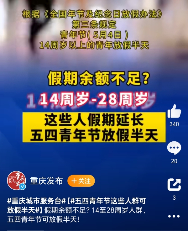 根据2007年颁布的《全国年节及纪念日放假办法》第三条之规定,青年节(5月4日),14周岁以上的青年放假半天。2008年4月,经国务院法制办的同意,“青年节”放假适用人群为14周岁到28周岁。即14周岁到28周岁的劳动者在五四青年节这一天享有半天假期。你是今天可以放假的年纪吗?