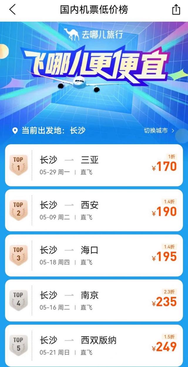 从去哪儿平台上可以看到,5月6日杭州直飞西安降至213元,5月7日北京直飞海口降至315元,5月8日武汉直飞昆明降至233元,5月9日上海直飞三亚降至245元,5月14日长沙直飞西双版纳降至229元,相比“五一”假期,出游的交通成本大幅降低。