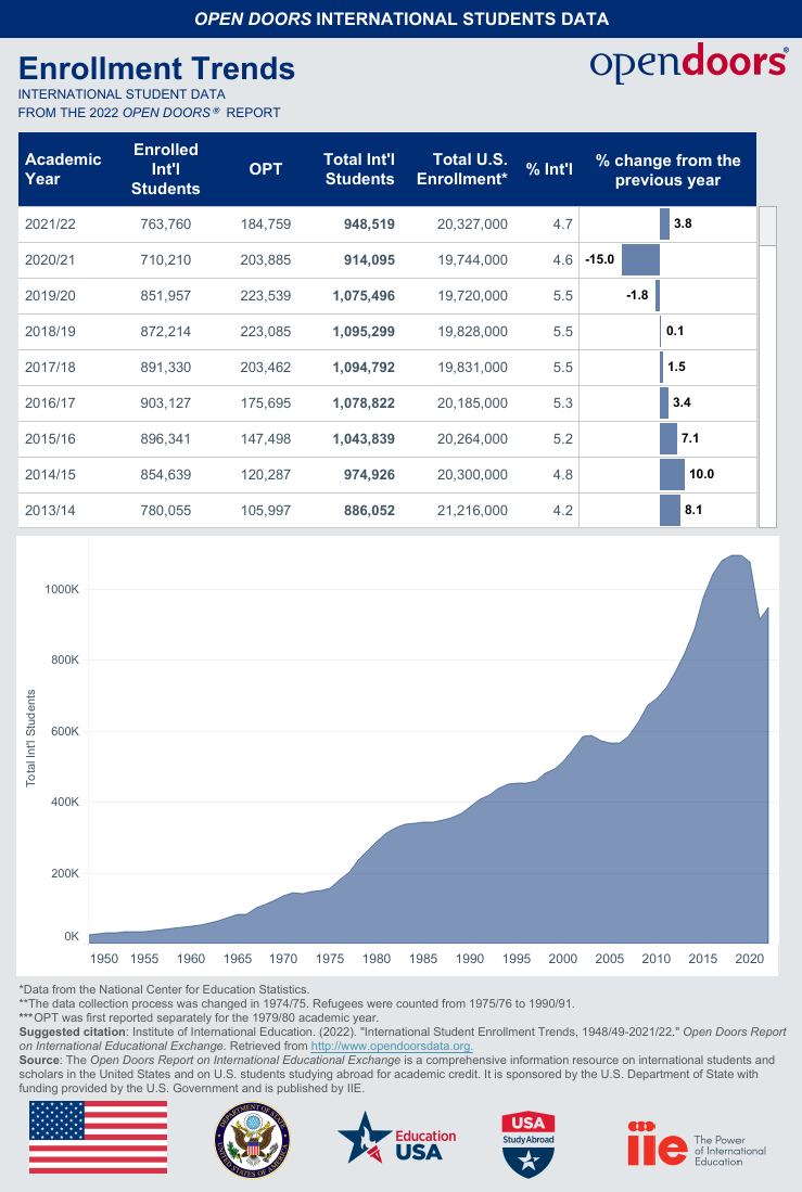 *来源:《美国门户开放报告》留学生总数达94万多人