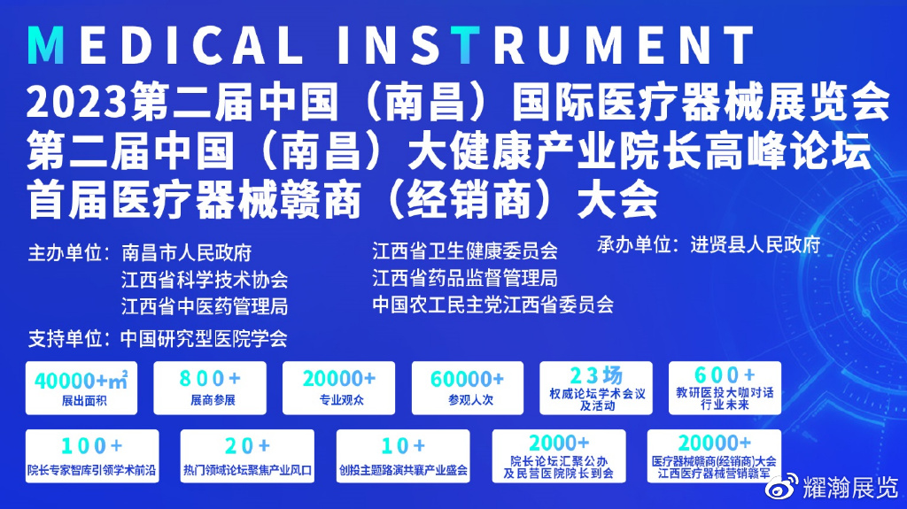 2023中国(南昌)国际医疗器械展会由南昌市人民政府、江西省卫健委、江西药监局等权威机构联合打造的江西省医疗卫生综合商贸服务平台。将于6月16-18日在南昌绿地国际博览中心举办。展会涵盖医学影像、远程移动智能监护医疗、诊断治疗设备、手术器械、病房护理设备及器具、消毒用品、辅助产品、口腔医疗器材、骨科医疗设备、眼科医疗设备、医疗用品及卫生材料、手术室、急救室、诊疗室设备等,汇聚国内外众多权威行业大咖以及知名的医疗器械制造商、经销商、代理商。汇聚全国各地的800多家参展商将携最新产品、技术同台竞技。众多知名头部企业将集体亮相展会,参展展品匠心独具,力争在本届展会上呈现医疗器械全产业链条的高水平和硬实力。